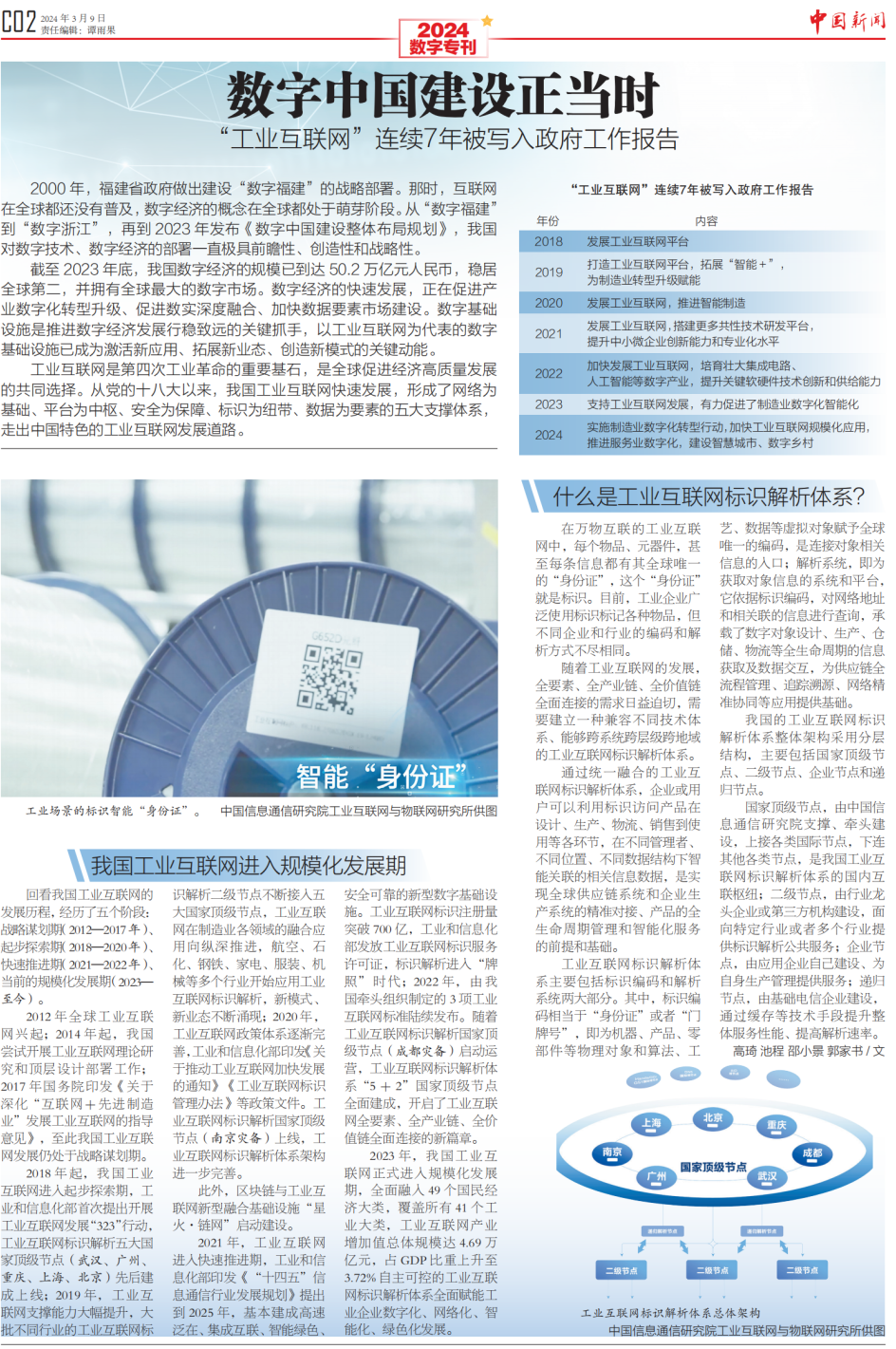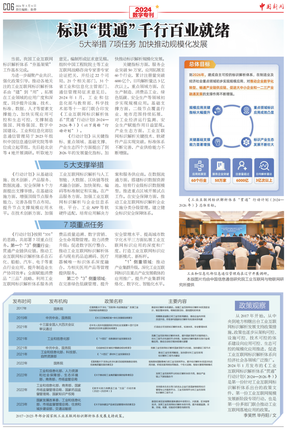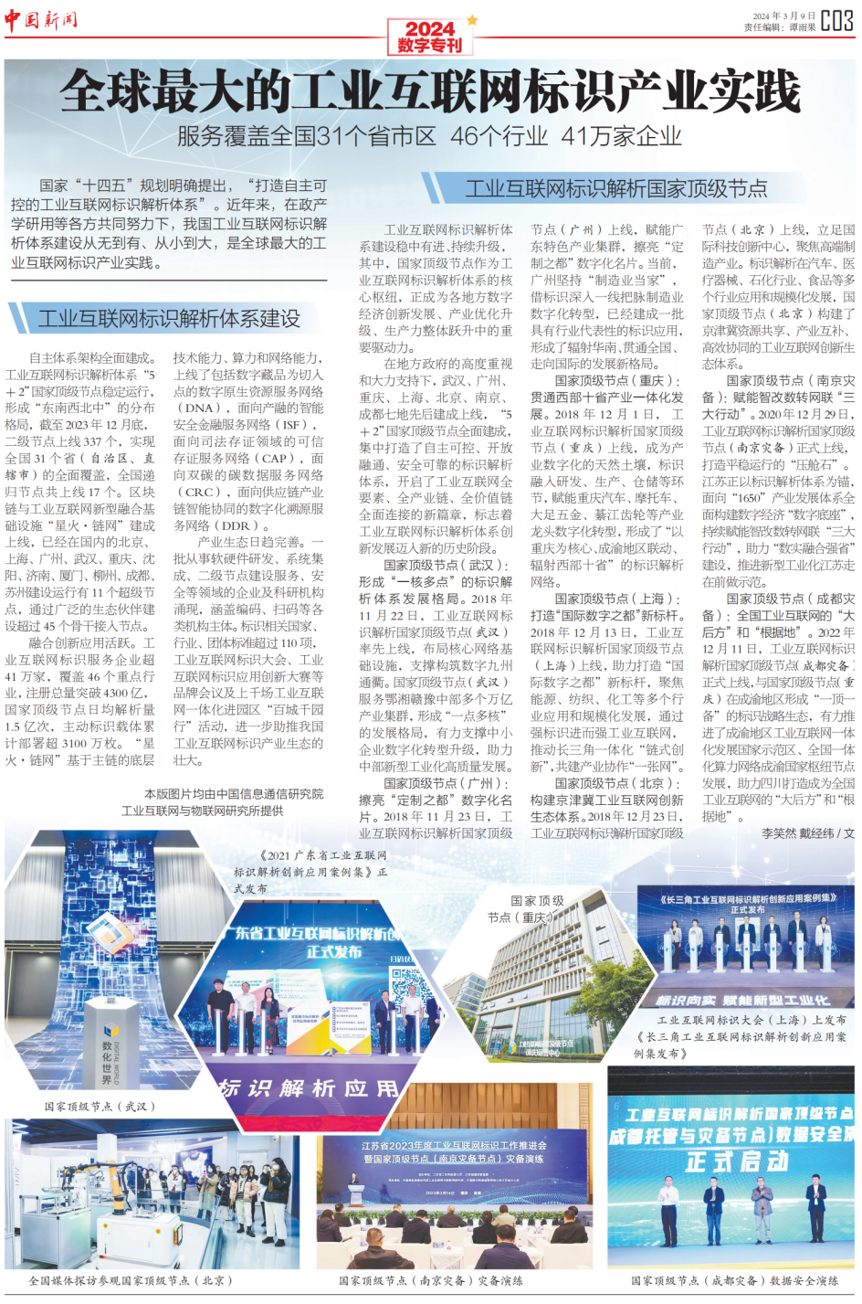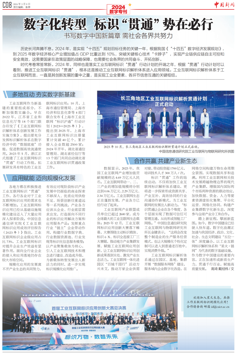 3月9日,《中國(guó)新聞》報(bào)推出全國(guó)兩會(huì)數(shù)字專刊,從工業(yè)互聯(lián)網(wǎng)標(biāo)識(shí)的蓬勃發(fā)展看“我們離數(shù)字中國(guó)還有多遠(yuǎn)”。報(bào)道指出“如今,數(shù)字中國(guó)建設(shè)已經(jīng)駛?cè)肟燔嚨溃怨I(yè)互聯(lián)網(wǎng)標(biāo)識(shí)解析體系和“星火·鏈網(wǎng)”為代表的數(shù)字基礎(chǔ)設(shè)施,作為數(shù)字中國(guó)建設(shè)的重要內(nèi)容,正在加速形成新質(zhì)生產(chǎn)力,貫通千行百業(yè),賦能高質(zhì)量發(fā)展。”標(biāo)識(shí)“貫通”勢(shì)在必行,規(guī)模化應(yīng)用的發(fā)展離不開產(chǎn)業(yè)生態(tài)的共同努力。