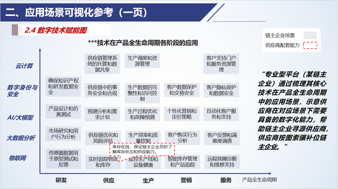 例如,橫軸表示產(chǎn)品生命周期各階段(如研發(fā)、供應(yīng)、生產(chǎn)、銷售、服務(wù)),縱軸表示應(yīng)用的數(shù)字技術(shù)(如物聯(lián)網(wǎng)、大數(shù)據(jù)分析、AI/大模型、數(shù)字身份與安全、云計(jì)算),在坐標(biāo)點(diǎn)處通過應(yīng)用場景(列表)展示不同技術(shù)在產(chǎn)品生命周期各階段的應(yīng)用。適用于技術(shù)專業(yè)平臺向制造企業(yè)展示賦能能力,制造企業(yè)從產(chǎn)品全生命周期、企業(yè)資產(chǎn)管理等業(yè)務(wù)維度規(guī)劃統(tǒng)籌數(shù)字化轉(zhuǎn)型,鏈主企業(yè)基于應(yīng)用場景規(guī)劃制定供應(yīng)商的數(shù)字化能力標(biāo)準(zhǔn)。