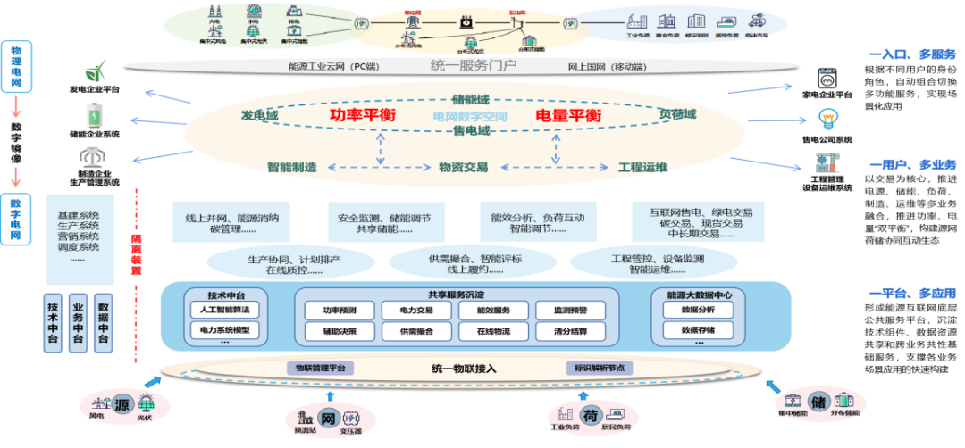 下一層是電力運(yùn)營的發(fā)電、儲能、負(fù)荷、售電域四大領(lǐng)域間的協(xié)同工作,確保電力系統(tǒng)的平衡和高效運(yùn)行。并給出電力供應(yīng)鏈支撐場景,通過智能制造、物資交易、工程運(yùn)維等實(shí)現(xiàn)供應(yīng)鏈的高效管理和優(yōu)化。再給出平臺支撐的線上業(yè)務(wù)場景,電力能源供應(yīng)鏈和電力運(yùn)營的細(xì)化線上場景,通過技術(shù)和服務(wù)平臺實(shí)現(xiàn)更高效、靈活和智能的電力管理。最下層是物理實(shí)體世界的數(shù)字化:按源、網(wǎng)、荷、儲電力運(yùn)營四大領(lǐng)域數(shù)字化,而不是堆砌設(shè)備。