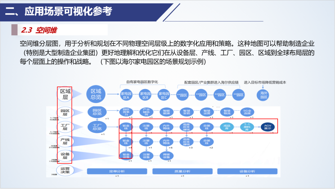 空間維分層圖,即空間維度的應(yīng)用場景地圖,用于分析和規(guī)劃在不同物理空間層級上的數(shù)字化應(yīng)用和策略。這種地圖可以幫助制造企業(yè)(特別是大型制造企業(yè)集團(tuán))更好地理解和優(yōu)化它們在從設(shè)備層、產(chǎn)線、工廠、園區(qū)、區(qū)域到全球布局層的每個(gè)層面上的操作和戰(zhàn)略。