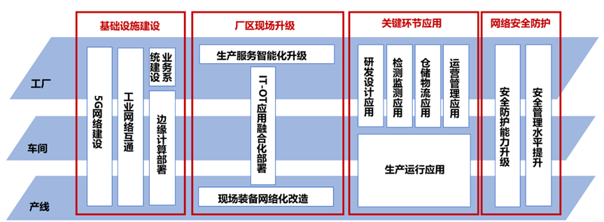 5G工廠建設(shè)內(nèi)容主要包含基礎(chǔ)設(shè)施建設(shè)、廠區(qū)現(xiàn)場升級、關(guān)鍵環(huán)節(jié)應(yīng)用、網(wǎng)絡(luò)安全防護等4個方面。