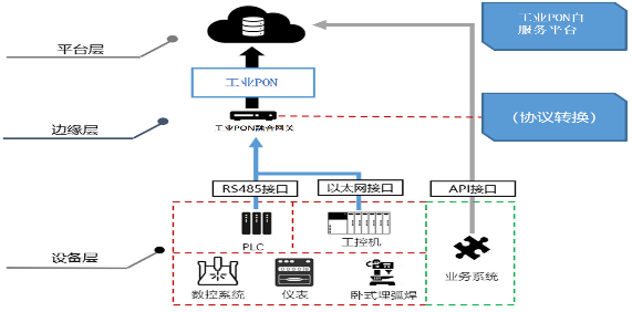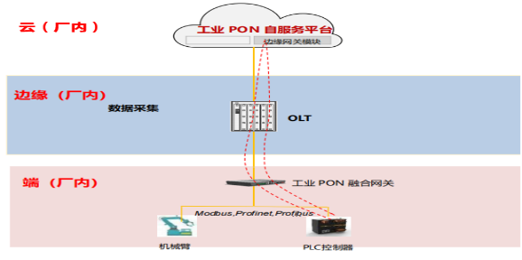 工業云端應用工業PON自服務平臺(包含邊緣網關模塊)OLTODN工業PON融合網關OLT設備具備邊緣計算特性網絡切片融合承載兼容工業接口開放式架構  端  云邊各類工業設備