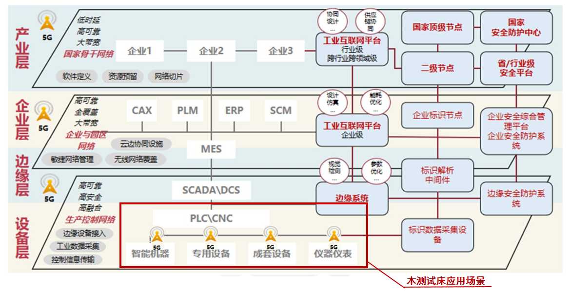 本測試床屬于AII總體架構中網絡互聯部分,其應用場景在AII《工業互聯網體系架構(版本2.0)》中的位置如下圖所示。在關鍵技術驗證上,本測試床重點測試驗證5G端到端確定性技術在高精度時間同步精度、可靠性、時延和抖動等維度可提供的通信服務能力;在應用場景驗證上,本測試床重點測試驗證5G確定性通信技術應用于PLC南向控制現場設備的能力和效果。
