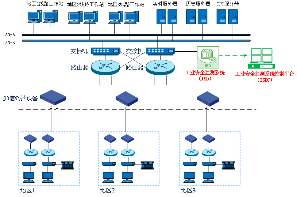 通過前期調研了解到,各廠站端的工業流量匯聚到分控中心。為能夠實時采集流量、不影響現有工業網絡,采取了在交換機旁路部署工業安全監測系統(ISD)進行安全監測,在分控中心采用工業安全監測控制平臺(ISDC)進行整體態勢感知的解決方案。