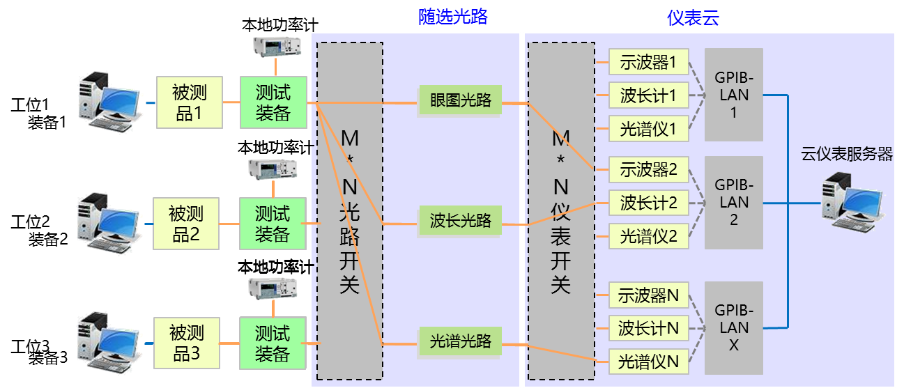 項目總體在于將儀表資源池成云,按需調用,改善之前被測品光指標測試要經過多個工位才能完成。周轉次數多,操作復雜,重復動作多的問題。在邏輯功能上可以分為儀表云本體及配套的隨選光路兩部分。