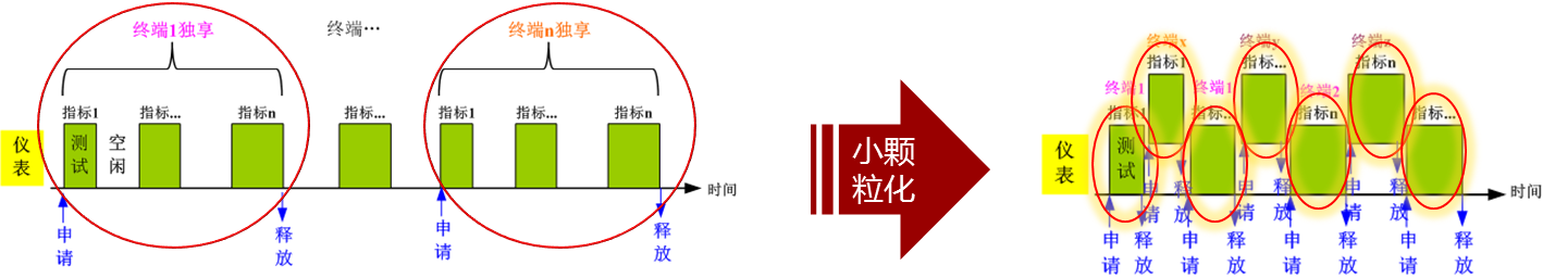 一項工作,這導致在測試多項指標時出現等待,延長了整體測試時間。為此將儀表通過虛擬化,分解為多項邏輯功能。通過對多臺儀表邏輯功能的小顆粒化調度,可以實現對同一設備多項指標不間斷的測試,節約測試時間。同時一臺儀表也可被動態調用于不同設備的測試,提高了儀表利用率,如圖3所示: