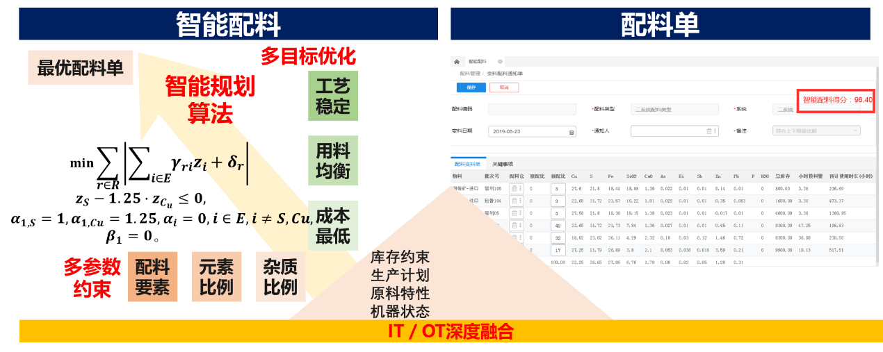 智能配料系統(tǒng)記錄配料相關(guān)的各種約束(約束條件在使用過程中進行迭代優(yōu)化),動態(tài)調(diào)用最新原料的存量和元素含量,由智能算法進行原料的投入配比規(guī)劃輸出。