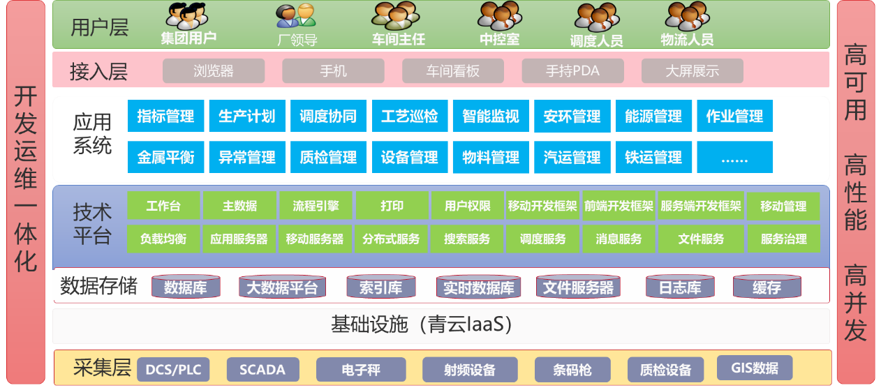 應(yīng)用層:主要包括指標管理、生產(chǎn)計劃、調(diào)度協(xié)同、工藝巡檢、智能監(jiān)視、安環(huán)管理、能源管理、作業(yè)管理、金屬平衡、異常管理、質(zhì)檢管理、設(shè)備管理、物料管理、汽運管理、鐵運管理等。