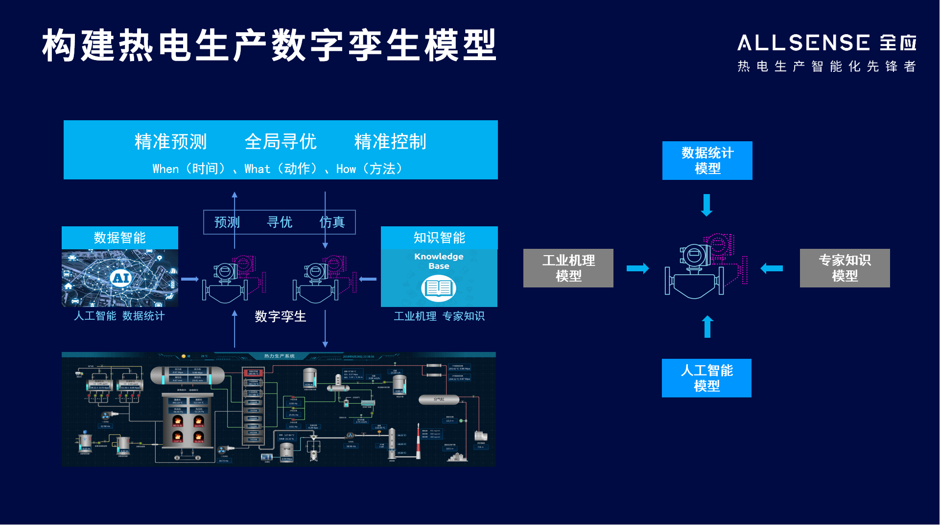 面對該企業(yè)當前熱電生產中面臨的突出問題,上海全應科技有限公司(以下簡稱“全應科技”)根據(jù)該企業(yè)當前設備情況以及具體生產工況,依托全應熱電云(面向熱電行業(yè)的工業(yè)互聯(lián)網(wǎng)),結合工業(yè)機理和專家知識,建立了覆蓋熱電生產系統(tǒng)端到端的數(shù)字孿生模型,覆蓋鍋爐、汽機、供熱管網(wǎng)、減溫減壓器等,實現(xiàn)該企業(yè)的生產系統(tǒng)進行全方位的智能化升級,為運行人員提供全局最優(yōu)的最佳的運行參數(shù)。