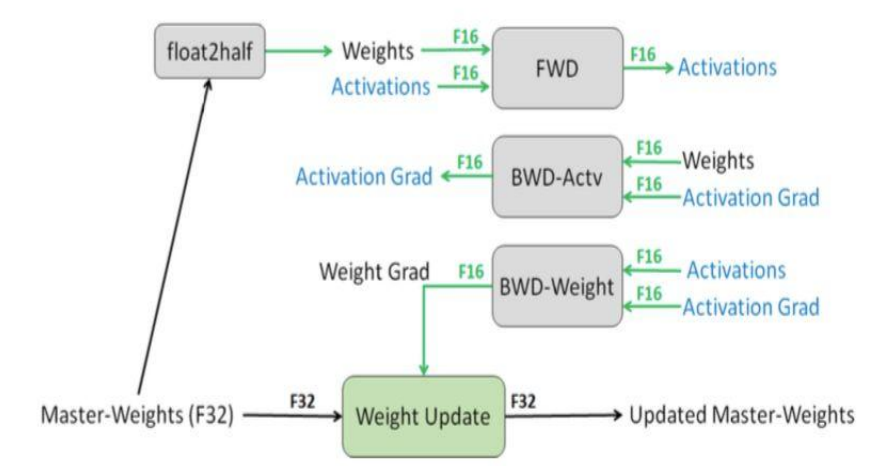 在訓練過程中綜合考慮模型的訓練速度和精度,如果使用全精度模型,會導致訓練速度慢、顯存占用高等問題,但是使用半精度模型,會大大降低模型精度,因此在訓練過程中思謀使用了半精度和全精度結合的混合精度方案,即大部分模型使用半精度,但是對于一些敏感的部分使用全精度,這種兩種精度相結合的混合精度訓練方式,可以將速度和精度的平衡達到最優。在系統部署思謀全部使用了半精度模型,來達到最快的運行速度,并且相比較與之前的混合精度模型,不會有精度損失。算法精度方案如圖4所示。