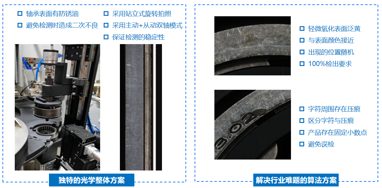 攻克了兩大行業難題——對生銹缺陷的精準識別,以及對臟污、壓傷缺陷的精準區分,實現了視覺技術在軸承檢測應用的新突破。方案兼容超過20種產品型號,可一次識別23種缺陷,檢出≥99.59%,過檢率≤5%,檢測水平領先行業。2實現百分百人力替代