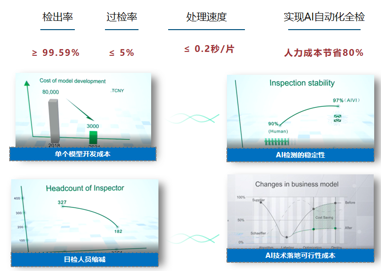思謀汽車軸承智能檢測與數據分析方案應用到產線后,達到了超出客戶預期的成效:一天可完成8萬片軸承檢測,處理速度小于0.2秒每片,檢出率大于99%,過檢率小于5%,處理速度小于0.2秒每片,實現AI全檢,為企業節省人力成本約80%實現條產線節省6人/每天圖11。幫助企業真正意義上實現的自動化生產,解決掉了生產環節上最后一個人員密集型工位,降低了人力成本,提升了產品質量。目前,該方案已經復制到客戶的4條產線中,持續為客戶降低成本,提升效益。該企業生產部門負責人對思謀給予了高度評價:“思謀AI技術解決了一直困擾平臺的產品質量問題,流入市場的產品真正實現了零缺陷。”