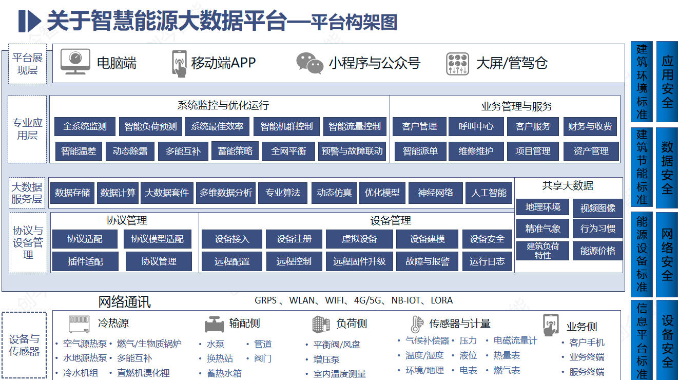 主要技術參數:系統數據采集與控制節點;熱源機組、水泵、管網、末端等全能源系統運行數據;能源消耗、地理環境、精準氣象、建筑負荷特性、用戶行為習慣等系統運行相關數據