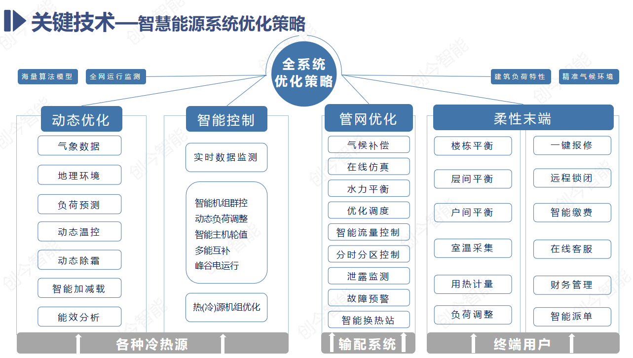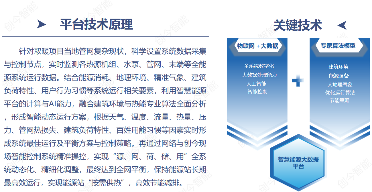 創今基于互聯網、大數據與人工智能技術,融合清潔能源,建筑環境,工農業生產等各領域專業技術與算法,面向政府部門、能源設備與系統供給企業、能源系統用戶、科研機構、工程設計、維護服務等相關機構提供綜合能源數字化、智慧化服務。智慧能源大數據平臺基于全面的系統運行數據監測和分析,結合熱能、建筑環境行業眾多專業算法和最佳效率模型,根據精準氣象、建筑負荷、用能習慣的變化精準預測每個能源站的動態負荷、并實時計算不同負荷條件下每個系統運行的最佳效率區間,智能調整與控制機組出力、啟停數量、溫度、流量、閥門開閉等系統運行狀態,保持能源站長期最高效運行,實現能源站“按需供熱”,高效節能。