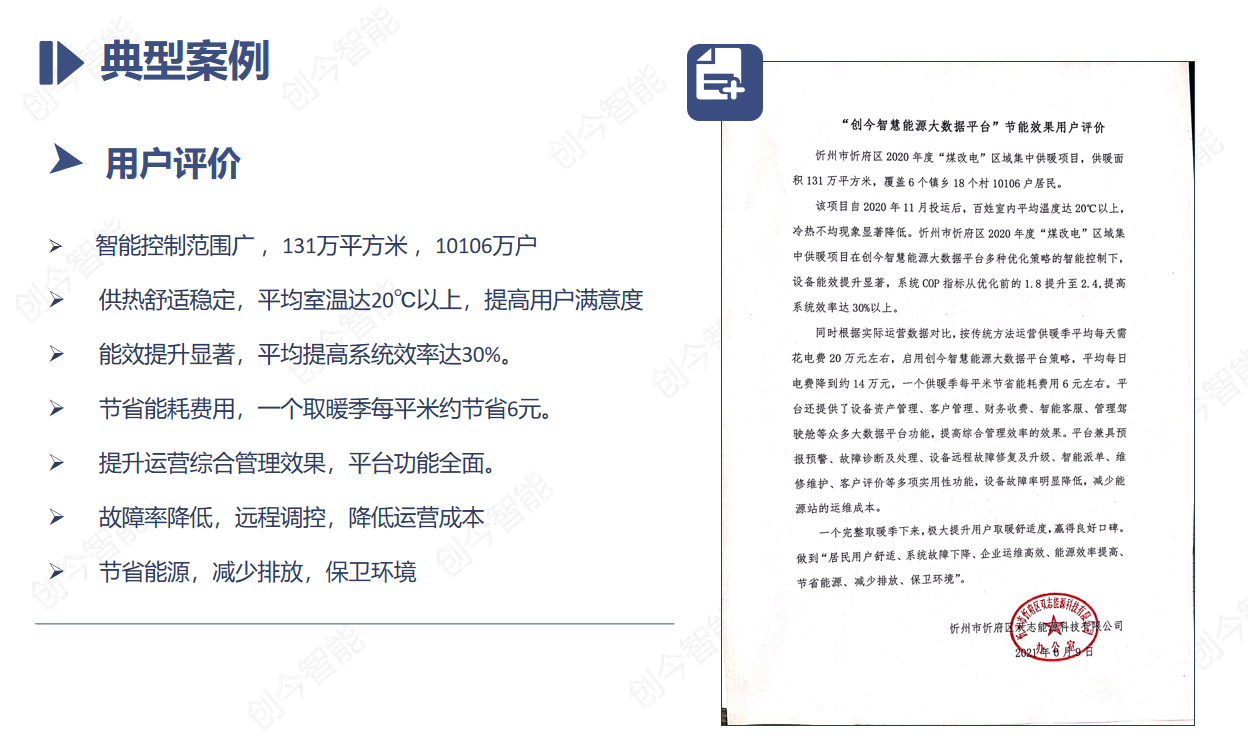 應用創今智慧能源大數據平臺,一個取暖季每平米降低能耗16度電,節約標準煤約6.4千克、二氧化碳減排約15.95千克、二氧化硫減排約0.48千克,氮氧化物減排約0.24千克。創今智慧能源大數據平臺用戶供暖面積總計166.49萬平方米,折算降低能耗2663.84萬度電,節約標準煤約10655.36噸、二氧化碳減排約26555.16噸、二氧化硫減排約799.15噸,氮氧化物減排約399.58噸。