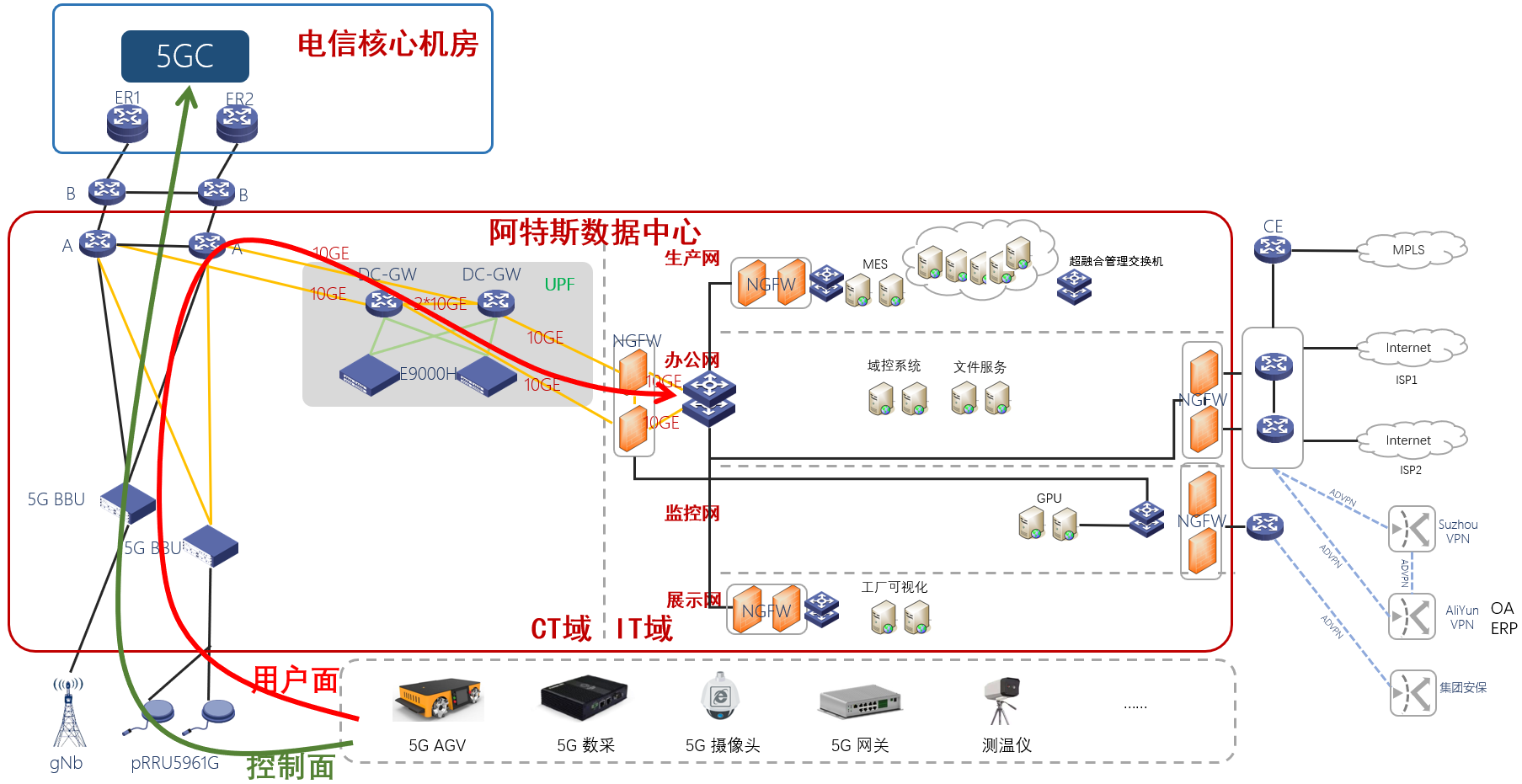 根據5G核心網控制面和用戶面分離的特點,將用戶面UPF下沉到阿特斯數據中心實現數據本地分流,保障企業核心數據安全,并進一步降低網絡時延,提升核心業務性能與體驗。