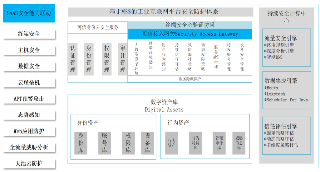 針對上述業務場景下的安全痛點問題,杭州安恒信息規劃設計并實施了一套基于MSS的工業互聯網平臺安全防護解決方案。該方案圍繞工業互聯網平臺安全、應用安全、數據安全、網絡安全、控制安全、設備安全,運用SaaS化、服務化的資源整合方式,形成按需分配、彈性擴展、高效可靠的安全能力資源池,并藉此構筑新型持續一體化安全防護體系,解決了工業互聯網平臺的云上業務系統安全問題。