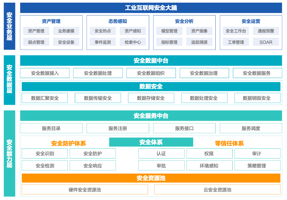圍繞工業互聯網邊緣層、工業IaaS層、工業PaaS層、工業SaaS層以及工業數據面臨的安全風險,建設覆蓋工業APP安全、工業云平臺安全、終端安全、數據安全需求的一站式安全能力資源池。
