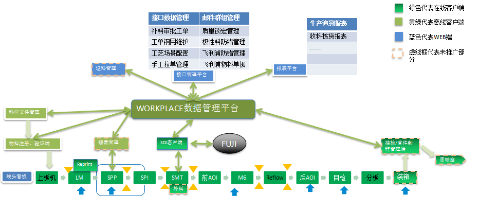 關(guān)鍵工位的采集數(shù)據(jù)都與板號(hào)關(guān)聯(lián),基于設(shè)備實(shí)時(shí)聯(lián)機(jī)實(shí)現(xiàn)產(chǎn)品在制工序全程閉環(huán)制程控制、高精度的單板物料追溯、SPI/AOI檢測(cè)信息追溯、實(shí)現(xiàn)(印刷機(jī)、前后AOI、SPI和整SMT段)良率、直通率的統(tǒng)計(jì)管理,工位的作業(yè)數(shù)據(jù)、生產(chǎn)報(bào)警、故障報(bào)警等等。