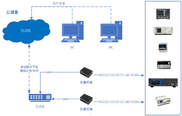 圖10 生產(chǎn)云測(cè)試架構(gòu)(部分傳輸已經(jīng)升級(jí)為光纖通信方案)