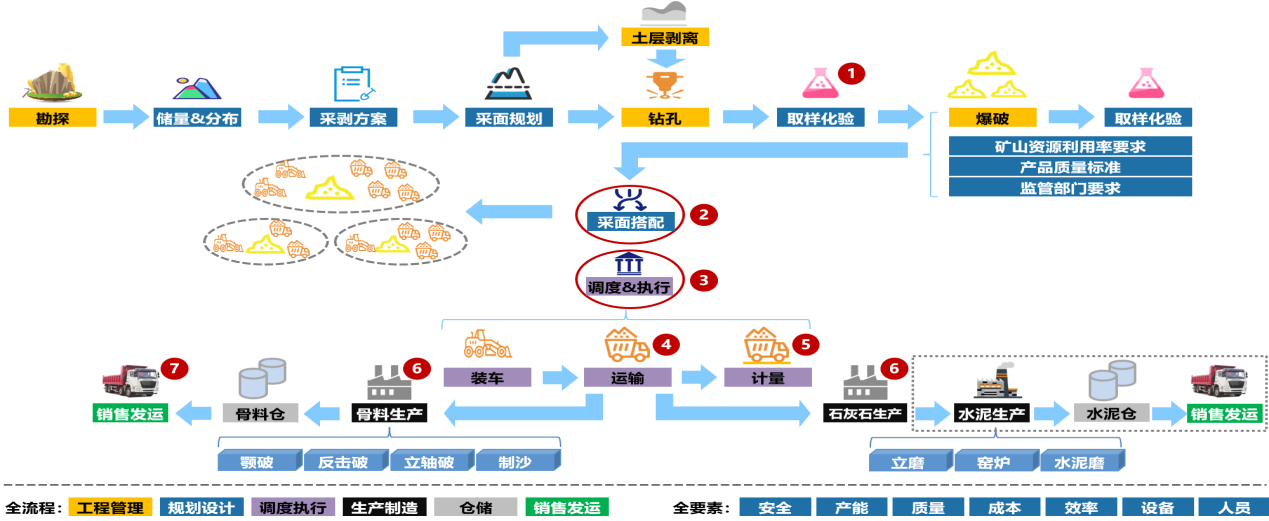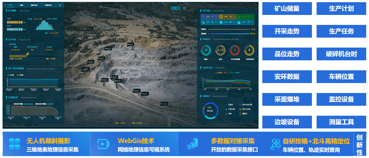 根據(jù)露天非金屬礦山企業(yè)的實(shí)際生產(chǎn)需求,結(jié)合行業(yè)痛點(diǎn),通過(guò)對(duì)礦山穿、爆、裝、運(yùn)、卸等各個(gè)生產(chǎn)環(huán)節(jié)長(zhǎng)期跟蹤調(diào)研,全流程收集分析生產(chǎn)數(shù)據(jù),采用信息化、數(shù)字化、智能化手段,對(duì)礦山資源開(kāi)采、生產(chǎn)計(jì)劃、爆破流程、車(chē)鏟調(diào)度、品位搭配、裝卸計(jì)量、安全管理等各個(gè)生產(chǎn)環(huán)節(jié)進(jìn)行流程優(yōu)化與管控,解決傳統(tǒng)礦山數(shù)字化程度低、生產(chǎn)數(shù)據(jù)遺失、業(yè)務(wù)環(huán)節(jié)分散不互通的難題,實(shí)現(xiàn)礦山資源開(kāi)采的數(shù)字化、安全生產(chǎn)的智能化以及智能管控的集成化。