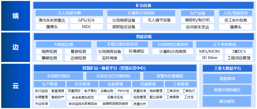 智慧礦山一體化平臺(tái)面向生產(chǎn)運(yùn)營(yíng)管理,融合5G、數(shù)字采礦、物聯(lián)網(wǎng)、無(wú)人機(jī)傾斜攝影、WEBGIS、無(wú)人駕駛等前沿技術(shù),通過(guò)管理對(duì)象的全聯(lián)接、數(shù)據(jù)的全融合,實(shí)現(xiàn)礦山資源開(kāi)采、穿孔爆破、車(chē)鏟調(diào)度、品位搭配、裝卸計(jì)量、安全管理等全過(guò)程的可視、可管、可控,幫助礦山企業(yè)打造安全、智能、高效的智慧礦山運(yùn)營(yíng)模式。