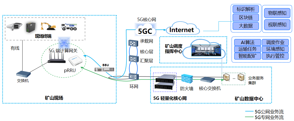 礦山開(kāi)采現(xiàn)場(chǎng)采用5G網(wǎng)絡(luò)鏈接遠(yuǎn)程挖機(jī)、無(wú)人駕駛車(chē)輛、工業(yè)采集網(wǎng)關(guān)等設(shè)備,通過(guò)工業(yè)環(huán)網(wǎng)數(shù)據(jù)傳輸至礦山數(shù)據(jù)中心為礦山調(diào)度智慧中心提供數(shù)據(jù)支持,同時(shí)通過(guò)互聯(lián)網(wǎng)鏈接云端標(biāo)識(shí)解析、區(qū)塊鏈、大數(shù)據(jù)、AI工場(chǎng)等云端支持平臺(tái)。