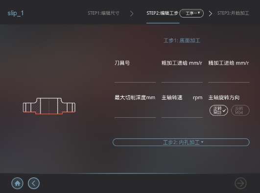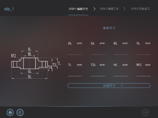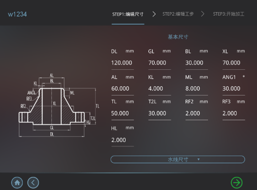 在新建程序模塊可以新建法蘭程序用于生產加工。首先,通過圖形化引導界面選擇法蘭類型,后根據需要選擇相應加工工步,補充填寫工件尺寸、工藝參數等信息,一鍵生成可執行程序,最后可直接運行加工程序,進行加工。
