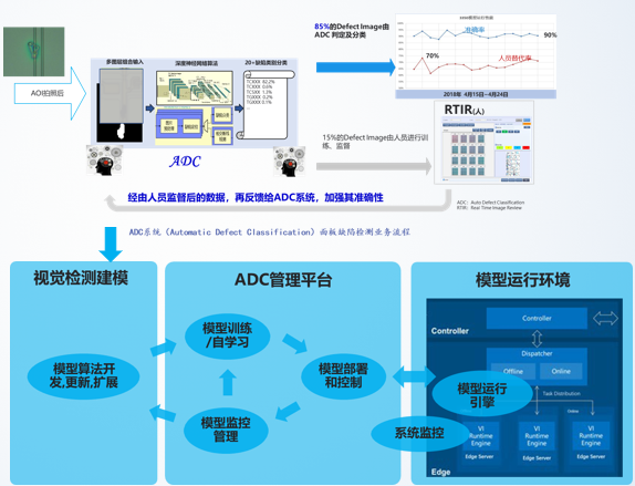 為了解決以上的問(wèn)題和痛點(diǎn),格創(chuàng)東智在華星光電導(dǎo)入了一套基于格創(chuàng)AI應(yīng)用平臺(tái)的自動(dòng)缺陷分類系統(tǒng),將人工智能算法與AOI設(shè)備結(jié)合,通過(guò)系統(tǒng)中的圖像識(shí)別算法以及深度學(xué)習(xí)算法,對(duì)各制程多種類的缺陷圖片進(jìn)行學(xué)習(xí)訓(xùn)練及建模,開(kāi)發(fā)出具備自主學(xué)習(xí)能力的檢測(cè)模型,代替了大量人工,實(shí)現(xiàn)了無(wú)間斷、高精準(zhǔn)的缺陷自主檢查判定功能。該系統(tǒng)也與生產(chǎn)良率系統(tǒng)對(duì)接,實(shí)現(xiàn)了自動(dòng)判定、異常報(bào)警、自動(dòng)攔截等功能。在系統(tǒng)管理平臺(tái)中,廠商可以自主完成模型訓(xùn)練,模型部署和模型管理,方便后期針對(duì)新產(chǎn)品以及新缺陷進(jìn)行模型擴(kuò)展和自訓(xùn)。