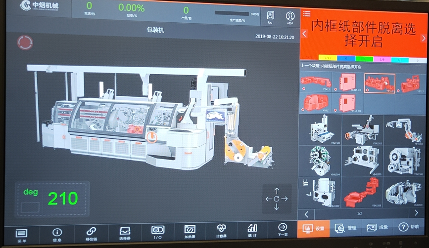ZB415煙機(jī)產(chǎn)線由主機(jī)加輔機(jī)組成,體積龐大。該智能機(jī)組內(nèi)置超過400個(gè)采集點(diǎn)位,每個(gè)點(diǎn)位的數(shù)據(jù)采集頻率均為毫秒級。因此系統(tǒng)每秒會產(chǎn)生海量的數(shù)據(jù),要將這些數(shù)據(jù)實(shí)時(shí)的傳輸?shù)綌?shù)字孿生系統(tǒng)中就需要5G網(wǎng)絡(luò)大帶寬的加持,通過數(shù)字孿生系統(tǒng)對機(jī)組的運(yùn)行狀態(tài)進(jìn)行遠(yuǎn)程的控制,如開機(jī)、停機(jī)、復(fù)位、包裝速度調(diào)整等。5G網(wǎng)絡(luò)的低時(shí)延、高可靠性確保了這些控制指令下發(fā)的實(shí)時(shí)性和可靠性。當(dāng)機(jī)組某一個(gè)零部件出現(xiàn)故障時(shí),數(shù)字孿生系統(tǒng)會通過布置在機(jī)組內(nèi)部的傳感器檢測到該零件,并立即在系統(tǒng)內(nèi)進(jìn)行報(bào)警;同時(shí)會聯(lián)動監(jiān)控?cái)z像頭定位到出現(xiàn)故障的零部件的位置,并放大監(jiān)控畫面以便于控制中心的專家進(jìn)行進(jìn)一步的故障診斷和確認(rèn)。