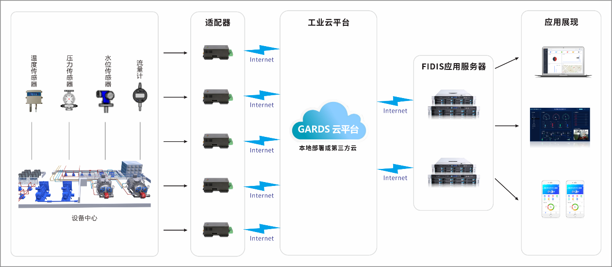 項(xiàng)目運(yùn)用IIOT技術(shù),包括數(shù)據(jù)采集適配器研制,大數(shù)據(jù)分析平臺(tái)以及一體化的管網(wǎng)監(jiān)控平臺(tái)研發(fā),旨在實(shí)現(xiàn)鍋爐設(shè)備的統(tǒng)一聯(lián)網(wǎng)功能、信息共享、智能化。將安裝的可編輯適配器終端在保持原有設(shè)備的前提下,通過數(shù)據(jù)采集裝置和控制器,去兼容適配鍋爐設(shè)備,并將搜集和梳理的數(shù)據(jù)整合處理后上報(bào)至物聯(lián)網(wǎng)云平臺(tái),同時(shí)接收物聯(lián)網(wǎng)云平臺(tái)發(fā)送的控制指令,將控制指令信息發(fā)送至現(xiàn)場(chǎng)的鍋爐工業(yè)設(shè)備,可進(jìn)行遠(yuǎn)程后臺(tái)對(duì)數(shù)據(jù)的實(shí)時(shí)在線分析和監(jiān)控管理。后臺(tái)端大數(shù)據(jù)處理量化,將以手機(jī)APP、液晶大屏顯示和電腦將信息展示在用戶面前,并且平臺(tái)能夠自動(dòng)判別鍋爐設(shè)備故障類型、得到設(shè)備故障風(fēng)險(xiǎn)預(yù)警時(shí)間,實(shí)現(xiàn)智能化生產(chǎn)、定位、追蹤、監(jiān)控、故障報(bào)警、設(shè)備故障預(yù)警和設(shè)備一體化管理。