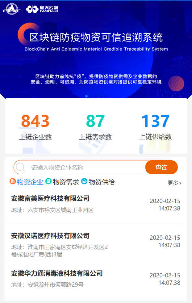 針對政府、企業等對防疫物資需求、供給等環節信息透明、安全、可追溯的需求,運用區塊鏈技術,開發區塊鏈防疫物資可信追溯系統,提供防疫物資上鏈可視化展示、供需信息審核標注等功能,為政府、企業提供了及時可靠的數據。
