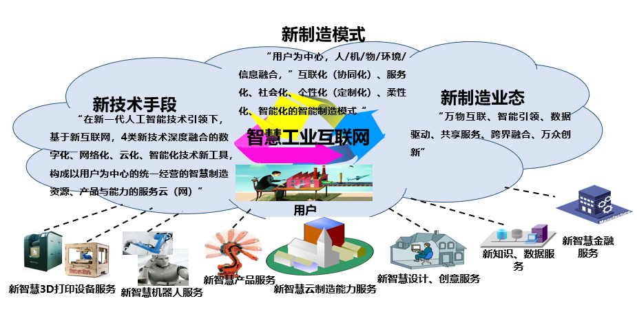 基于泛在新互聯網,在新一代智能科學技術引領下,借助新一代智能科學技術、新制造科學技術、新信息通信科學技術、及新制造應用領域專業技術等4類新技術深度融合的數字化、網絡化、云化、智能化技術新工具,構成以用戶為中心的統一經營的多層新智慧制造資源/能力/產品的服務云(網),使用戶通過新智慧終端及新智慧制造服務平臺便能隨時隨地按需獲取新智慧制造資源/能力/產品服務,進而優質、高效完成制造全生命周期的各類活動。