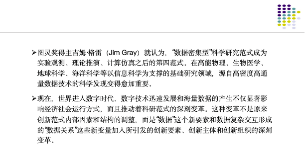 數據產業鏈條中,各環節參與方的行為和以往不一樣,這個方面要研究的新問題很多。因為最近我在做一項數字時代創新問題研究,就拿它舉例。現在數據創新范式按照國內外的很多學者來說,進入了“數據密集型”的科研創新范式。我們能看到除了數字行業自身以外,生物醫學、高能物理、地球科學、海洋科學很多都是以信息科學為支撐的基礎研究領域,如果數據觀測處理能力不高,它們的進展是非常困難的。生命科學中,蛋白質怎么預測出來,不是生命科學自身的原創性發現,而是數字技術應用帶來的結果,其中的原理早就知道,但就是算不出來。現在,世界進入數字時代,數字技術迅速發展和海量數據的產生不僅顯著影響經濟社會運行方式,而且推動著科研范式的深刻變革。這種變革不是原來創新范式內部因素和結構的調整,而是“數據”這個新要素和數據復雜交互形成的“數據關系”這些新變量加入所引發的創新要素、創新主體和創新組織的深刻變革。