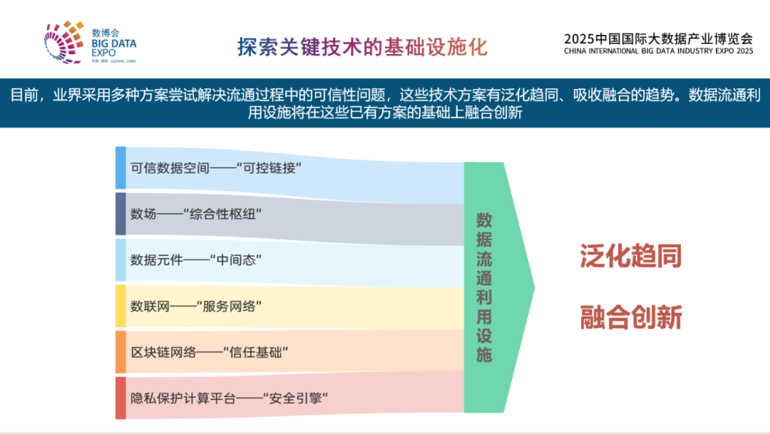 數據流通怎樣實現從數據本身到價值的交互?現在有6條技術路線,同時在探索在實踐。不同技術路線各有側重,例如可信數據空間關注可控和連接問題,數場側重綜合性樞紐問題,數據元件探索標準中間態的問題,數聯網強調服務網絡的概念,區塊鏈網絡提供信任基礎,而隱私保護計算平臺強調安全引擎。各有側重,但是在收斂和融合過程中,這些技術路線會趨同于一個真正實現大規模數據流通所需要的一個基本功能和體系架構。