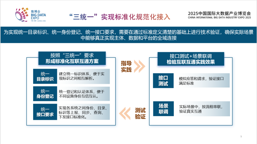 對于如何實現連接?《指引》中提到“三統一”,即統一的目錄標識、統一的身份登記、統一的接口要求。統一的目錄標識,包含數據里所蘊含各種各樣多維信息,我們可以去標識它、找到它、解析它。統一的身份,不僅只是數據所有者,也包括跟所有利益相關方,身份都需要統一,這樣我們才可以在平臺上建立可信的連接。統一的接口,是要對所有涉及的系統之間目錄標識、身份等的交互實現標準化。通過統一的目錄標識、統一的身份登記、統一的接口要求,把分布在企業、區域里孤立的數據連接起來。為落實這些要求,國家數據局也組織了相應的測試、聯調,檢驗互聯互通的實踐成果。