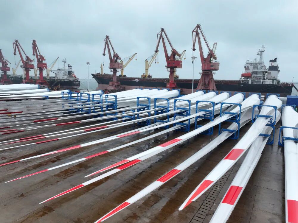 2025年10月13日,在江蘇省連云港港東方港務分公司碼頭,大批風電設備集港準備裝船出口國外(無人機照片)。新華社發(王春 攝)