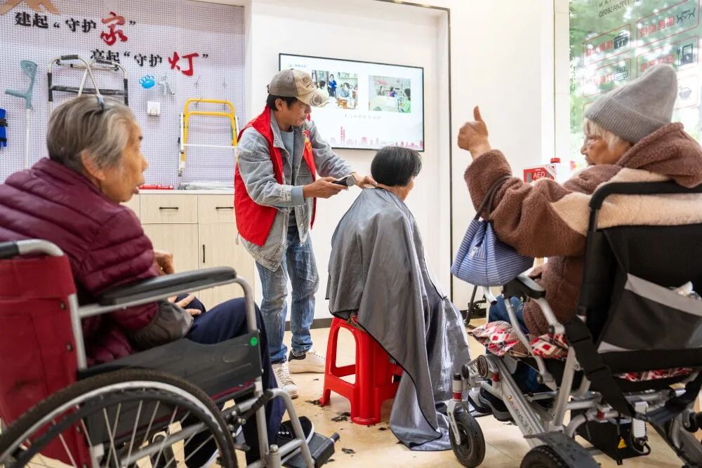 2025年11月6日,在湖南省長沙市望城區高塘嶺街道湘陵社區,志愿者為老年人和殘疾人士免費理發。新華社記者 陳思汗 攝