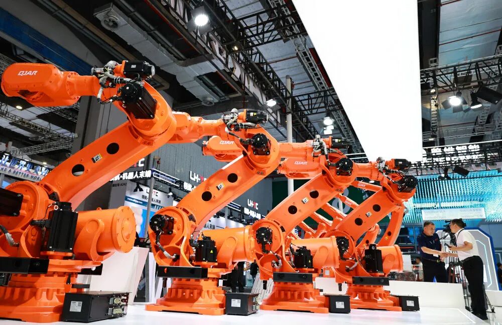 這是2025年9月23日在上海舉行的第25屆中國國際工業博覽會上拍攝的一組大型工業機器人產品。新華社記者 方喆 攝