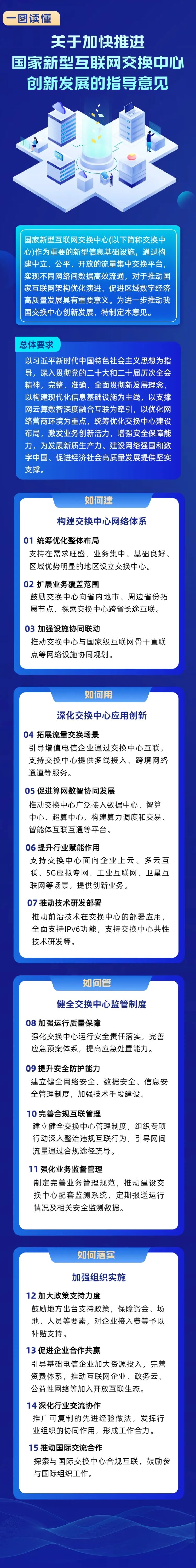 《指導(dǎo)意見》明確以習(xí)近平新時代中國特色社會主義思想為指導(dǎo),貫徹新發(fā)展理念,以構(gòu)建現(xiàn)代化信息基礎(chǔ)設(shè)施為主線,以支撐網(wǎng)云算數(shù)智深度融合互聯(lián)為牽引,以優(yōu)化網(wǎng)絡(luò)營商環(huán)境為重點,統(tǒng)籌優(yōu)化交換中心建設(shè)布局,激發(fā)業(yè)務(wù)創(chuàng)新活力,增強(qiáng)安全保障能力,為經(jīng)濟(jì)社會高質(zhì)量發(fā)展提供堅實支撐。