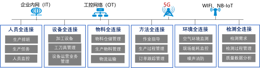 圖1:5G全連接工廠人、機、料、法、環、測等聯網內容示例