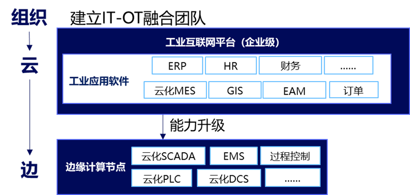 在5G全連接工廠建設中,建議改變原有工廠內IT-OT系統應用建設運營方式,組織IT-OT融合團隊,對IT-OT進行一體化部署,通過應用軟件或系統功能的云化部署,研發面向工廠生產、運營、管理等需要的各類移動端應用程序(APP),建立起扁平化、靈活化 “云-邊”協同架構,形成IT-OT應用的統籌建設、統一運維、統一管理,并促進形成工廠內同時要加快推進云網融合,實現網絡資源、計算資源、平臺資源等橫向打通,提升工廠生產運營管理效率。