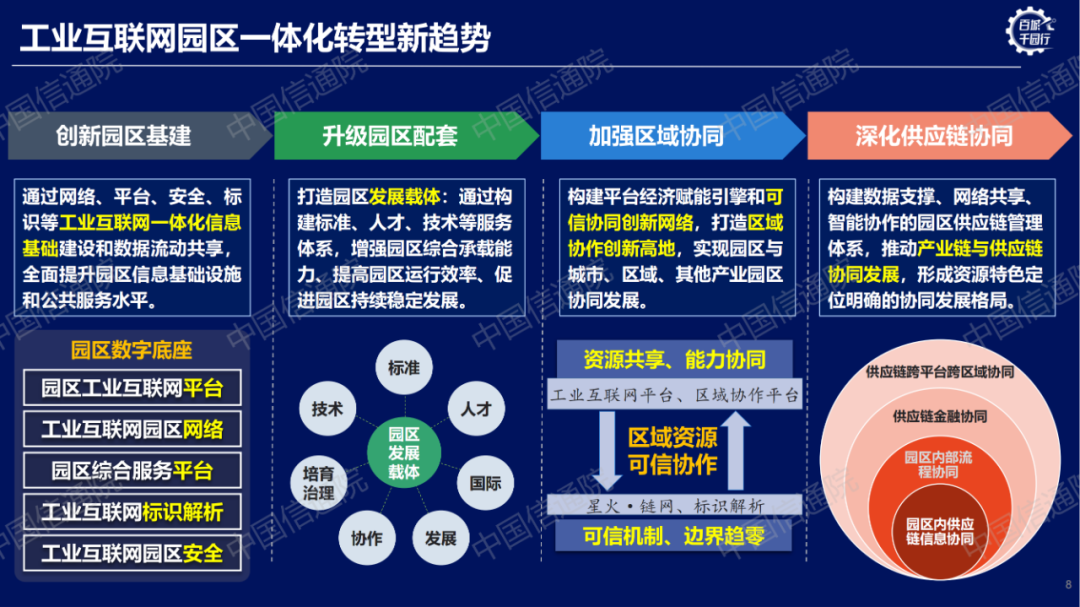 工業(yè)互聯(lián)網(wǎng)園區(qū)是以高質(zhì)量發(fā)展為目標(biāo),按照工業(yè)互聯(lián)網(wǎng)內(nèi)涵要求,規(guī)劃、建設(shè)、運營、提升的新型園區(qū)。園區(qū)應(yīng)緊密圍繞我國建設(shè)現(xiàn)代化經(jīng)濟體系這一戰(zhàn)略目標(biāo),以協(xié)同創(chuàng)新、集群集約、虛實融合、綠色低碳、安全生產(chǎn)為導(dǎo)向,通過網(wǎng)絡(luò)、標(biāo)識、平臺、安全體系和新模式、新業(yè)態(tài)的構(gòu)建,來指導(dǎo)新園區(qū)建設(shè)和存量園區(qū)轉(zhuǎn)型發(fā)展。
