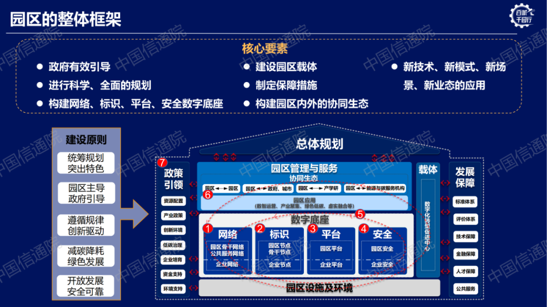 工業(yè)互聯(lián)網(wǎng)園區(qū)整體框架:工業(yè)互聯(lián)網(wǎng)園區(qū)的建設(shè)與發(fā)展,應(yīng)在國家和各級地方政府政策措施的引領(lǐng)下,以科學(xué)規(guī)劃為指導(dǎo),通過打造網(wǎng)絡(luò)、標(biāo)識、平臺、安全等園區(qū)數(shù)字底座,構(gòu)建園區(qū)內(nèi)部與外部的數(shù)據(jù)流動閉環(huán),形成各產(chǎn)業(yè)角色之間的協(xié)同有機生態(tài)。建設(shè)數(shù)字化轉(zhuǎn)型促進中心等載體,以標(biāo)準(zhǔn)、評價、金融等體系為保障,通過新技術(shù)、新模式、新場景、新業(yè)態(tài)的應(yīng)用,形成園區(qū)的健康、低碳、良性、區(qū)域一體化發(fā)展的新發(fā)展模式,建立園區(qū)發(fā)展特色和發(fā)展優(yōu)勢。