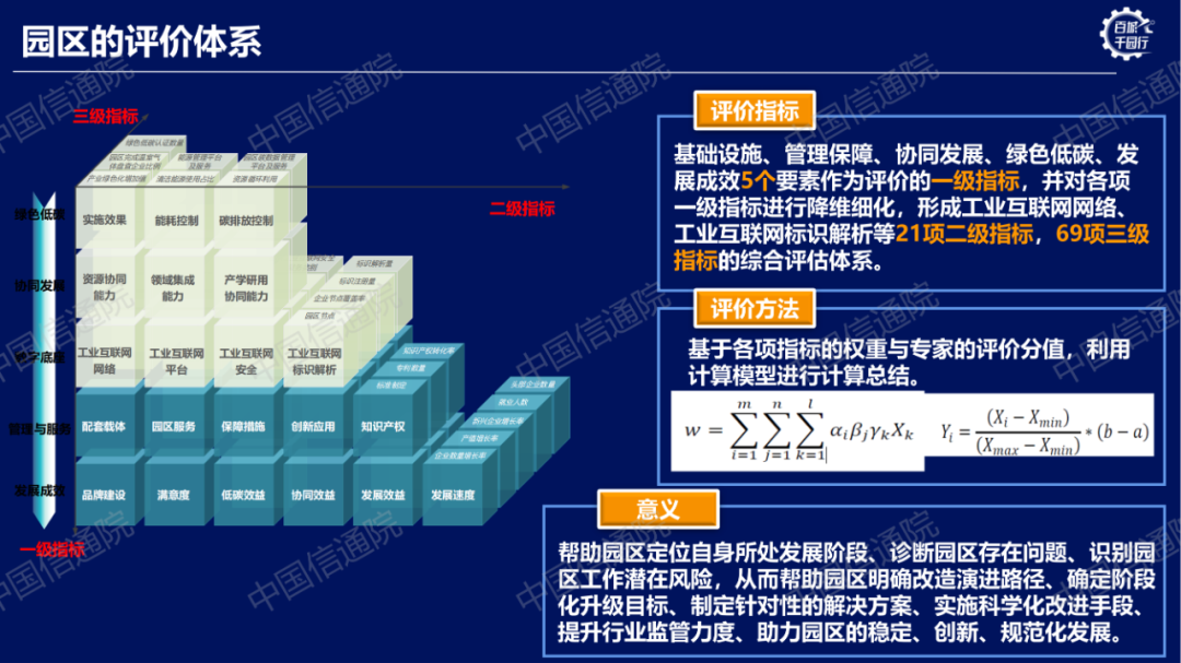 工業(yè)互聯(lián)網(wǎng)園區(qū)評價指標(biāo)體系通過科學(xué)的方法,分別從數(shù)字底座、管理與服務(wù)、協(xié)同發(fā)展、綠色低碳、發(fā)展成效5個要素作為評價的一級指標(biāo),并對各項一級指標(biāo)進行細化,形成工業(yè)互聯(lián)網(wǎng)網(wǎng)絡(luò)、工業(yè)互聯(lián)網(wǎng)標(biāo)識解析等21項二級指標(biāo),69項三級指標(biāo)的綜合評估體系。