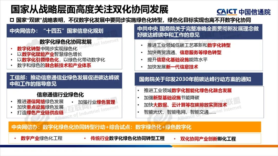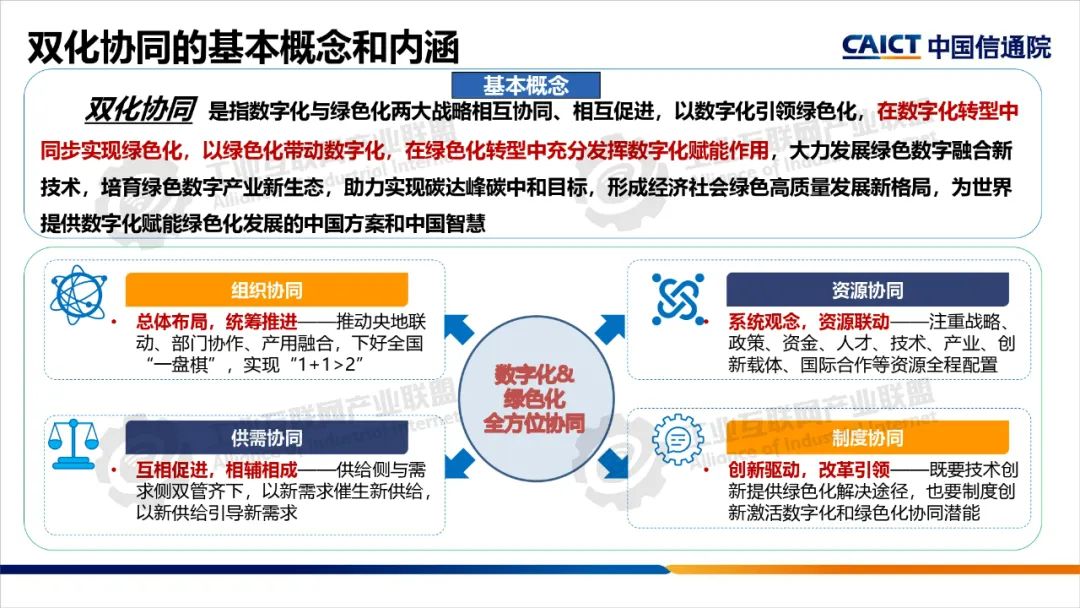 本期為您帶來由中國信息通信研究院產業與規劃研究所高級工程師王婧媛分享的《數字化綠色化協同轉型綜合試點建設解讀》。數字化轉型和綠色化轉型不僅是當今世界發展的兩大主題,也是相互依存、相互促進的孿生體?!半p化協同”是指數字化與綠色化兩大戰略相互協同、相互促進,在數字化轉型中同步實現綠色化,以綠色化帶動數字化,在綠色化轉型中充分發揮數字化賦能作用,大力發展綠色數字融合新技術,培育綠色數字產業新生態。