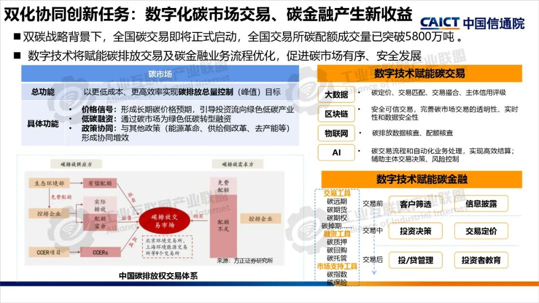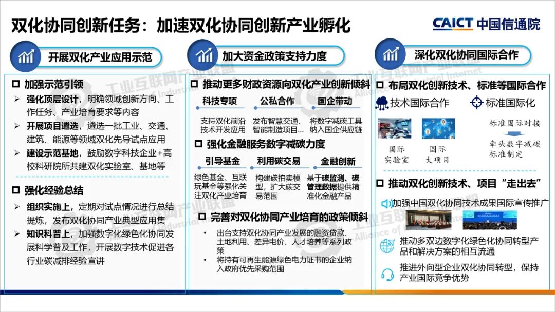 2022年,中央網信辦等五部門聯合開展了雙化協同綜合試點建設,要求各試點地區制定具體實施方案,部署了五大建設方向。雙化綜合試點地區要將雙化協同理念、建設方向與地區雙碳工作相互結合,從打造數字底座+綠色底座夯實雙化基礎,以雙化治理探明地區碳排放底數、支撐決策治理,以雙化賦能實現數字產業綠色化、傳統產業和生活低碳化,以雙化創新開展數字化生態資源、碳市場和碳金融的高效價值轉化,培育雙化新技術、新產業,最后還要配套雙化協同政策、要素、標準、財稅等機制創新。