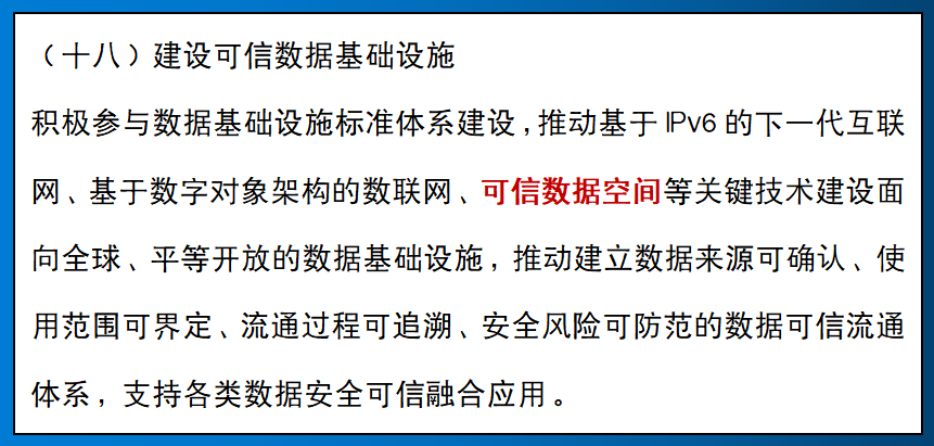 為貫徹落實黨中央、國務院關于構建數據基礎制度更好發揮數據要素作用的決策部署,深入實施《北京市數字經濟促進條例》,北京市發布《關于更好發揮數據要素作用進一步加快發展數字經濟的實施意見》(以下簡稱《實施意見》),明確:推動基于IPv6的下一代互聯網、基于數字對象架構的數聯網、可信數據空間等關鍵技術建設面向全球、平等開放的數據基礎設施。