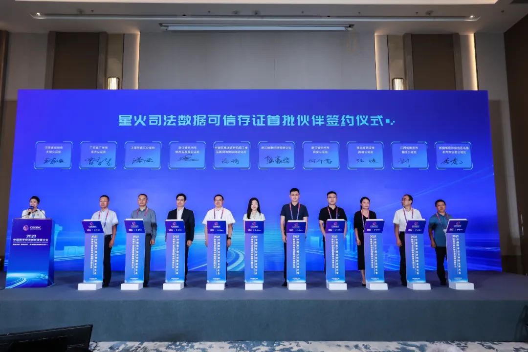 星火司法數據可信存證首批簽約儀式星火司法數據可信存證首批伙伴簽約儀式上,高琦、浙江數秦科技有限公司副總裁陳豪鳴分別與浙江省杭州市杭州互聯網公證處主任徐小蔚、浙江省杭州市臨安公證處主任助理何介嵩、上海市徐匯公證處主任潘浩、湖北省武漢市尚信公證處主任張沫、廣東省廣州市南方公證處副主任曾育生、江西省南昌市贛江公證處副主任劉建勇、河南省鄭州市大豫公證處副主任王家立、新疆維吾爾自治區烏魯木齊市法諾公證處主任李虎共8家單位代表進行三方協議現場簽約,未來,星火司法數據可信存證服務將積極構建行業數據共享生態,為數字空間的發展提供可信存證環境,支撐數字經濟健康發展。