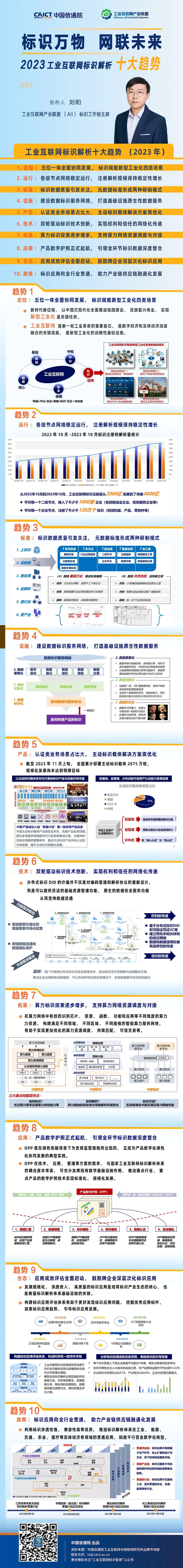 預測工業互聯網標識解析領域即將發生的變革對產業發展具有指導性意義。在11月14日,2023年工業互聯網標識大會(江蘇),工業互聯網產業聯盟標識工作組主席、中國信息通信研究院工業互聯網與物聯網研究所副總工程師劉陽發布了工業互聯網標識解析十大趨勢(2023年)。該趨勢從標識解析體系的定位、運行、標準、設施、產品、技術、拓展、應用、生態和政策這十個角度,關注已在產業鏈上下游形成強大生態的技術,著眼于前沿技術的探索與實踐驗證,以洞察標識解析技術在新型工業化中的角色轉換、產業創新和應用場景的演變。